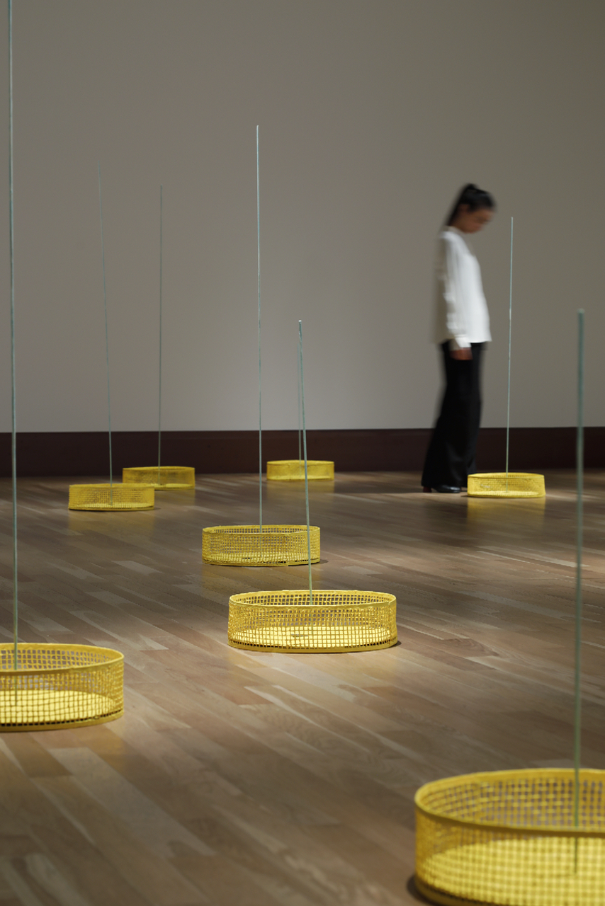 本作は、21個のオブジェクトを配置して空間を構成するインスタレーション作品です。鉛のプレートに封じられたひまわりの種と、大地から太陽に向かって伸びるひまわり畑を想起させるオブジェクトが並ぶ空間を通して、見えない生命の鼓動や、人と自然の関係を静かに映し出しています。